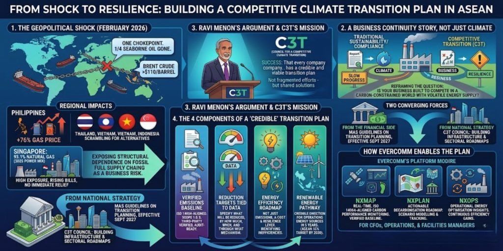 The energy shock that hit ASEAN in early 2026 was a preview — not an anomaly. Geopolitical disruption of fossil fuel supply chains is a recurring risk, not a one-time event. The structural answer, as Ravi Menon argued, is energy efficiency and renewables — not as climate virtue, but as business resilience.