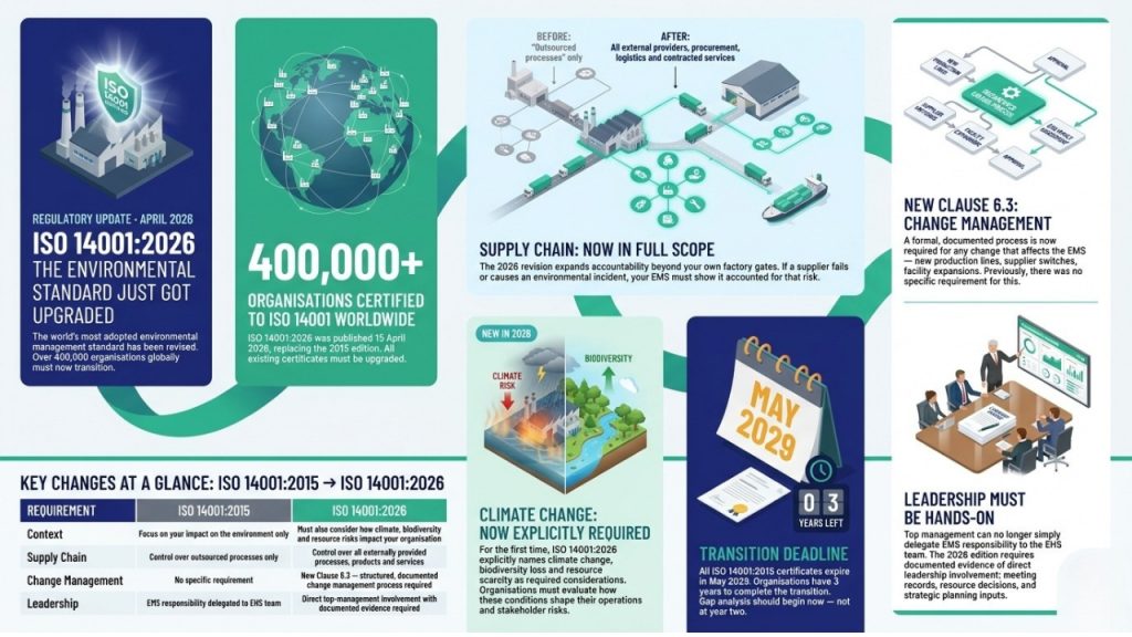 On 15 April 2026, ISO published the updated ISO 14001:2026 — the world’s most widely adopted environmental management standard. Over 400,000 organisations globally hold ISO 14001 certification. Every one of them now has three years to transition.